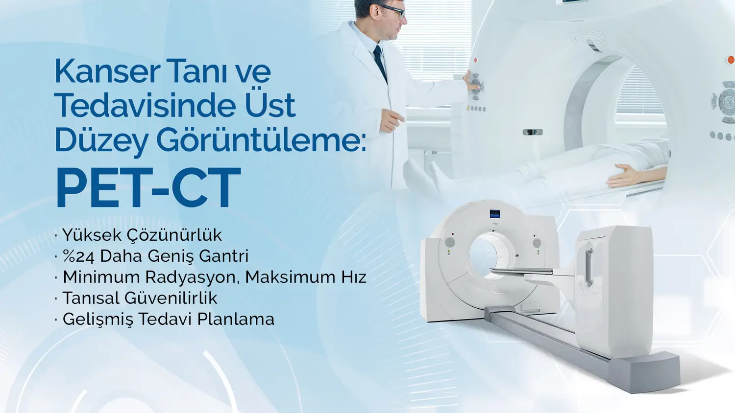 İki ayrı cihazın birleşerek tek bir cihaz haline getirildiği ileri bir görüntüleme yöntemi olan PET-CT, kalp ve nörolojik rahatsızlıkların yanı sıra özellikle onkoloji alanında aktif rol üstlenmektedir. Vücudu baştan sona düşük radyasyon ve yüksek hızda tarama özelliği sayesinde; kanser hastalıklarının teşhisi, tedavi planlaması ve tedavi sonrası değerlendirme süreçlerinde kullanılmaktadır.